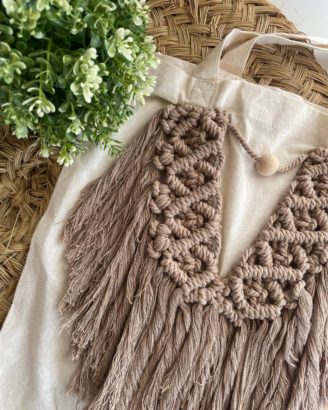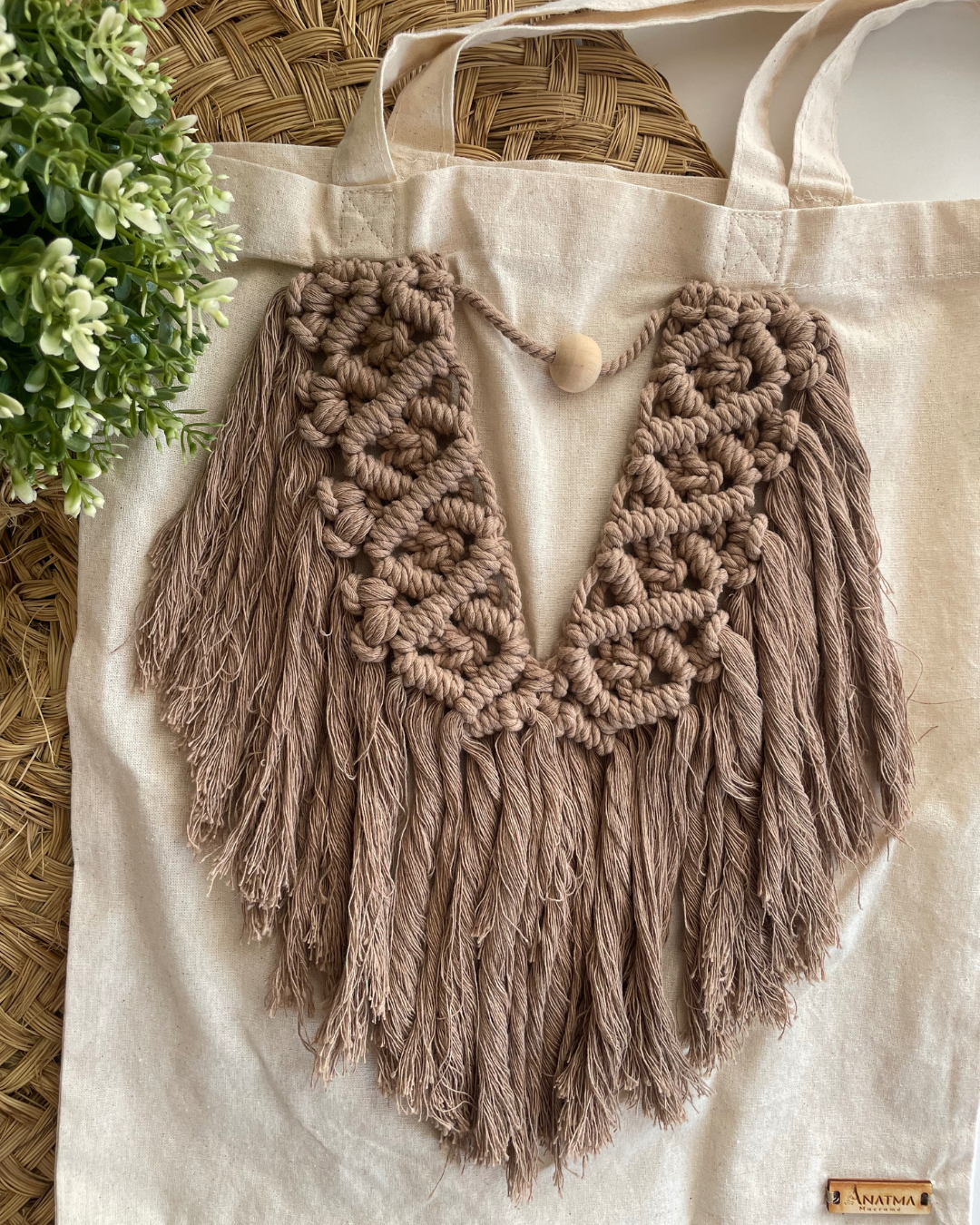 Tote bag de tela con un tapiz decorativo de macramé hecho a mano.